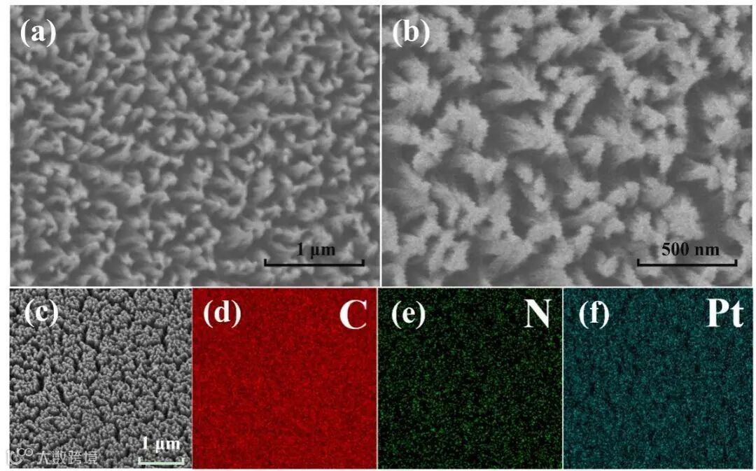 图2. (a, b) 垂直排列的PANI纳米阵列的扫描电子显微镜图像,以及 (c-f) Pt-PANI的能量散射谱图。