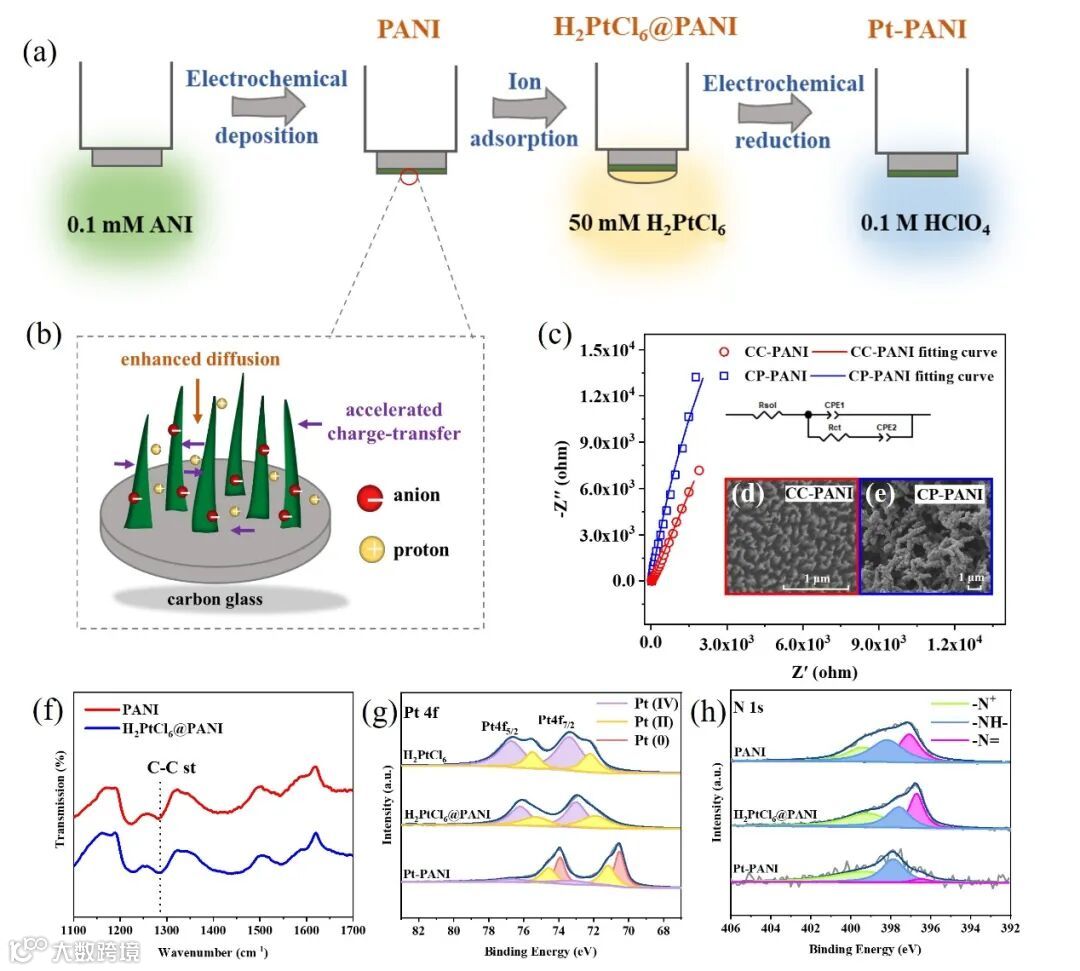 图1. (a) 制备过程。(b) 玻碳电极上PANI垂直生长示意图以及纳米线阵列中优化的离子扩散路径。(c) 具有不同形态的PANI的Nyquist图(CC-PANI和CP-PANI),插入的SEM图像是(d) CC-PANI和(e) CP-PANI,分别使用恒定电流密度和恒定电位法制备。EIS在开路电压下,0.1 M HClO4中进行测试。(f) PANI和H2PtCl6@PANI的FTIR光谱。高分辨率XPS光谱的Pt 4f (g) H2PtCl6,H2PtCl6@PANI和Pt-PANI,(h) PANI的N 1s,H2PtCl6@PANI和Pt-PANI。Pt 4f5/2和Pt 4f7/2峰的自旋轨道分裂和面积比分别为3.4eV和3:4。