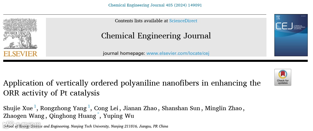 近日,来自南京工业大学黄庆红教授、吴宇平教授团队在国际知名期刊Chemical Engineering Journal上发表题为“Application of vertically ordered polyaniline nanofibers in enhancing the ORR activity of Pt catalysis”的观点文章。该观点文章探索了电子丰富聚合物作为载体在高效ORR催化剂中的潜在应用。