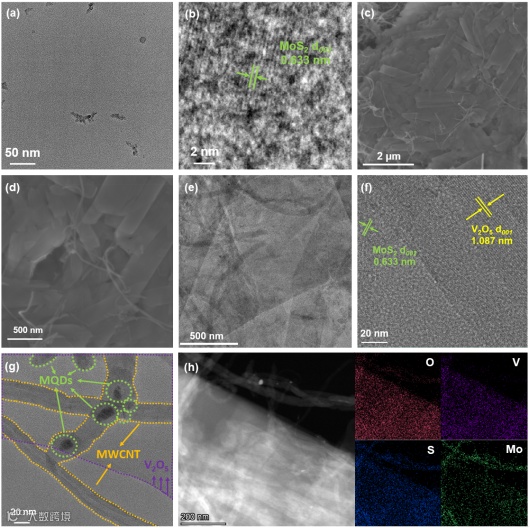 利用水热法合成了具有催化去溶剂化效应的MoS2量子点(MQDs)催化剂。随后,通过在V2O5正极材料表面锚定MQDs,并以多壁碳纳米管(MWCNT)作为MQDs载体,合成了V2O5·xH2O/MQDs/MWCNT(V-MQ-MC)正极材料。MQDs 均匀地固定在分散良好的碳纳米管和V2O5表面。这样的结构更有利于MQDs与V2O5表面的接触,从而增强对DME溶剂分子的去溶剂化作用。此外,与 Li+相比,Mg2+的极化程度更高,与正极材料间的库伦相互作用更强,从而导致缓慢的扩散动力学。V-MQ-MC中的层间结构水的存在会带来显著的 "静电屏蔽 "效应,能有效屏蔽Mg2+与正极材料晶格阴离子之间的静电作用和电荷极化,从而通过促进Mg2+的迁移和扩散来加速反应动力学。此外,由于水在非嵌入位点具有稳定的氢键构型,因此在整个放电过程中可容纳更多的 Mg2+。