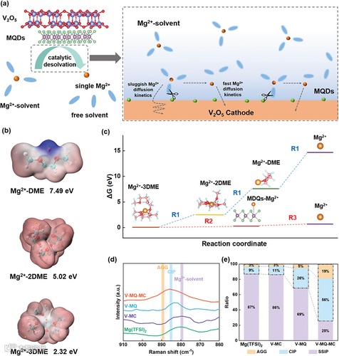 计算得出的Mg2+-3DME、Mg2+-2DME和Mg2+-DME的自然去溶剂化能垒分别为 2.32、5.02和7.49 eV。在MQDs的存在下,Mg2+-3DME的去溶剂化能显著降低至0.18 eV。拉曼测试证明,在引入MQDs催化剂后,电解液体系中AGGs(聚合离子对)和CIPs(接触离子对)比例增加,这一变化表明Mg2+的溶剂化结构发生了明显变化,证明了MQDs加快了去溶剂化进程。