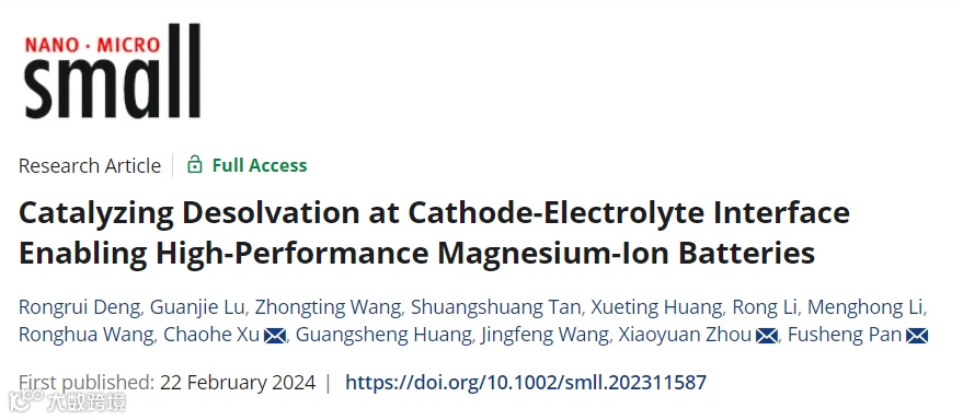 近日,来自重庆大学的潘复生院士、周小元教授、徐朝和教授团队在国际知名期刊Small上发表题为“Catalyzing Desolvation at Cathode-Electrolyte Interface Enabling High-Performance Magnesium-Ion Batteries”的研究论文。该文章首次在镁离子电池体系中提出CEI界面原位催化去溶剂化的概念,实现了溶剂化离子Mg2+-3DME到单个Mg2+的转化,这有利于半径较小的Mg2+直接插层到正极材料的晶格中,并赋予了其快速的动力学特性。