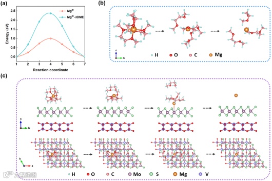 本研究引入了MQDs来催化去溶剂化,Mg2+-3DME趋向于通过MoS2来解离溶剂基团。通过计算,Mg2+的扩散系数约为Mg2+-3DME的 1.37×1023倍。这种明显的差异表明,MQDs对Mg-DME的去溶剂化是解决MIB缓慢动力学的有效策略,这是从材料设计角度攻克去溶剂化难题的一种新方法。具体来说,MoS2会优先与二甲醚结合,破坏Mg2+-3DME结构中的溶解壳层,催化溶解键断裂,从而使Mg2+吸附在MoS2表面。随后,在电化学反应过程中,游离的单个Mg2+作为活性离子插入到V2O5晶格中。