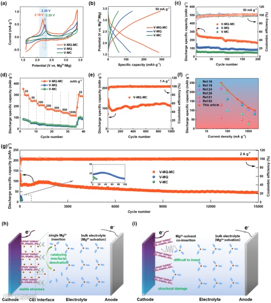 使用三电极系统进行了CV测试,结果表明V-MQ-MC的电流密度和积分面积都高于V-MQ(引入MoS2量子点催化剂,但未引入MWCNT)和 V-MC(引入MWCNT,但未引入MoS2量子点催化剂)正极,这表明它具有更高的比容量。V-MQ-MC的峰值有较大的偏移,这意味着其具有更小的过电势和更好的电子转移过程,这归因于MQDs对Mg-DME的催化去溶剂化作用。在50 mA g–1的电流密度下V-MQ-MC的首次放电比容量高达 319.5 mAh g–1,远高于 V-MQ 和 V-MC 正极。随后,在2 A g–1的大电流密度下进行测试,V-MQ-MC仍然表现出优异的循环稳定性,在15 000次循环后仍保持超过70 mAh g–1的容量,库仑效率超过99.8%。与其他V2O5基储镁正极对比,V-MQ-MC正极具有明显的优势。