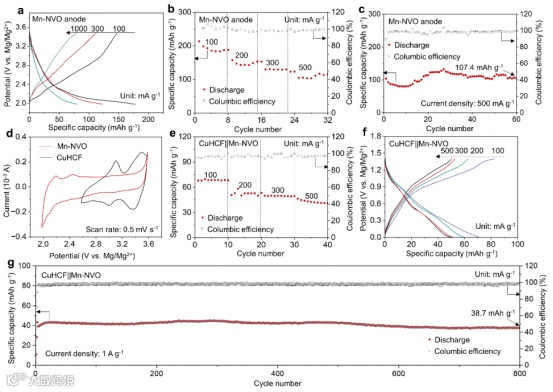 用优化后的MAU117作为电解质,锰掺杂的钒酸钠(Mn-NVO)作为负极,在100 mA g-1电流密度下具有191.6 mAh g-1的高可逆放电容量,在500 mA g-1电流密度下具有110.2 mAh g-1的高倍率性能。当以铜普鲁士蓝(CuHCF)作为正极搭建水系镁离子全电池时,CuHCF||Mn-NVO全电池在1000 mA g-1电流密度下具有优异的倍率性能以及800次循环的高稳定性。