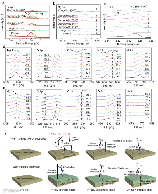 图5 Mn-NVO负极表面SEI的成分分析及其呼吸效应探讨。(a-c)Mn-NVO电极在不同放电/充电状态下V 2p、Mg 1s和O 1s区域的高分辨率XPS光谱。Mn-NVO电极在(d)第一次完全充电和(e)第一次完全放电状态下不同Ar+溅射时间的XPS谱图。(f)分别与1 M MgCl2/H2O和MAU117电解质组装在Mn-NVO电极界面上的反应示意图。