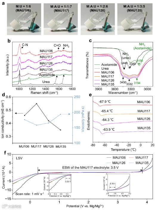 图1. 设计的新型镁离子共晶电解质的合成以及不同成分共晶电解质的基本性质表征。(a)按不同摩尔比nMg2+:nacetamide:nurea制备的共晶电解质(MAU106 1:0:6;MAU117 1:1:7;MAU126 1:2:6;MAU135 1:3:5)的照片。乙酰胺、尿素、MAU106、MAU117、MAU126和MAU135的(b)拉曼光谱和(c)傅立叶变换红外光谱。MAU106、MAU117、MAU126 和 MAU135 电解质的(d)离子传导性和粘度比较以及(e)它们的DSC数据。(f)制备的MAU106、MAU117、MAU126和MAU135电解质的LSV曲线。插图为[-0.6 V, 0.5 V]和[3.6 V, 4.2 V]范围的放大区域。