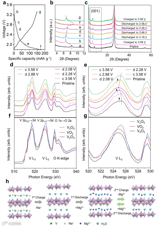 图4. Mn-NVO负极的储镁机制分析。(a)Mn-NVO第一圈循环的电压-容量图。(b)不同充/放电状态下的非原位XRD,以及(c)对应的全谱。(d-g)不同充/放电状态下的非原位同步辐射数据。(h)Mn-NVO的储镁机理概念图。