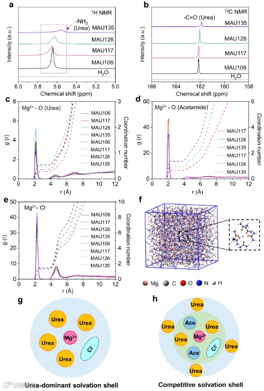 图2. 不同比例乙酰胺的引入:通过竞争溶剂化策略对共晶电解质的优化。水和四种共晶电解质的(a)1H NMR和(b)13C NMR曲线。(c-e)通过分子动力学模拟不同乙酰胺含量的共晶电解质得到的Mg2+-O(尿素)、Mg2+-O(乙酰胺)和Mg2+-Cl-的径向分布函数。(f)分子动力学模拟得到的局部三维特写和MAU117共晶电解质中具有代表性的Mg2+溶解结构。(g)尿素主导的溶剂化鞘层(h)和乙酰胺加入后竞争溶剂化效应的示意图。