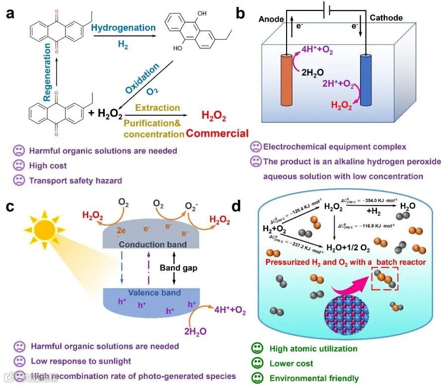 目前,工业上主要使用蒽醌自氧化制造工艺,能够高效合成H2O2,但是其合成步骤复杂,会产生较多污染物。同时,用于电化学合成H2O2的设备相对复杂;H2O2的光催化合成过程需要有机溶剂。然而,直接合成过氧化氢(DSHP)是比当前工业过程更具原子效率的合成路线,其可以通过反应器系统实现小规模的现场合成。