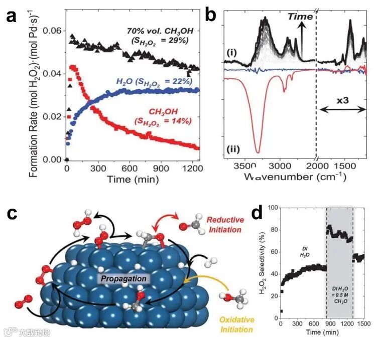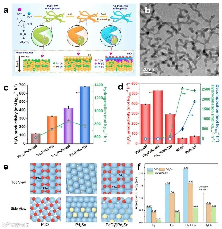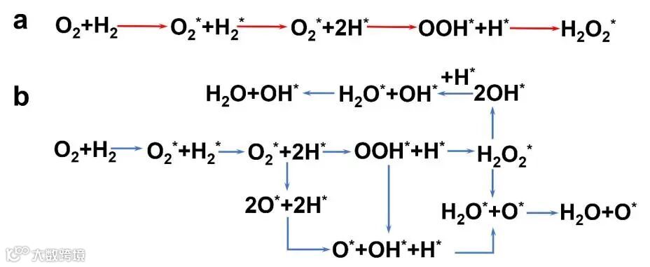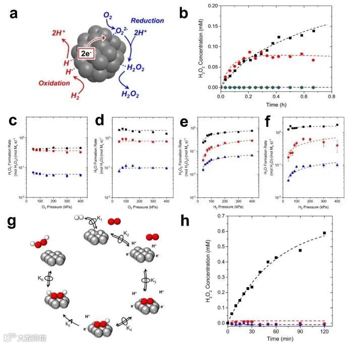 DSHP反应中生成H2O2选择性低的主要原因是反应过程中的中间体O2*、OOH*与H2O2*中的O-O键断裂为O*,并于H*反应生产水。因此,对于设计高效催化剂而言,可能最大的挑战在于增强超氧自由基的存在。并且,引入质子以及使用特定的溶剂会对反应机理产生影响。溶剂可以在金属纳米粒子表面参与形成一种氧化还原调节子并增强纳米粒子表面物种的反应性。