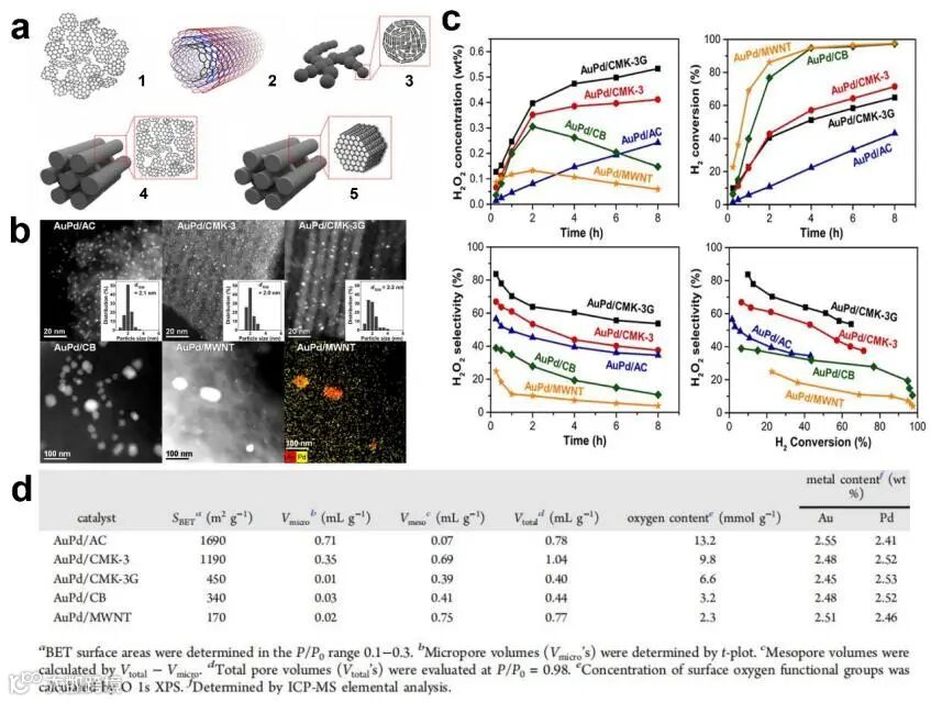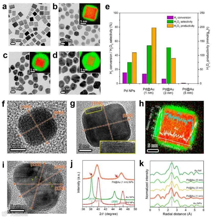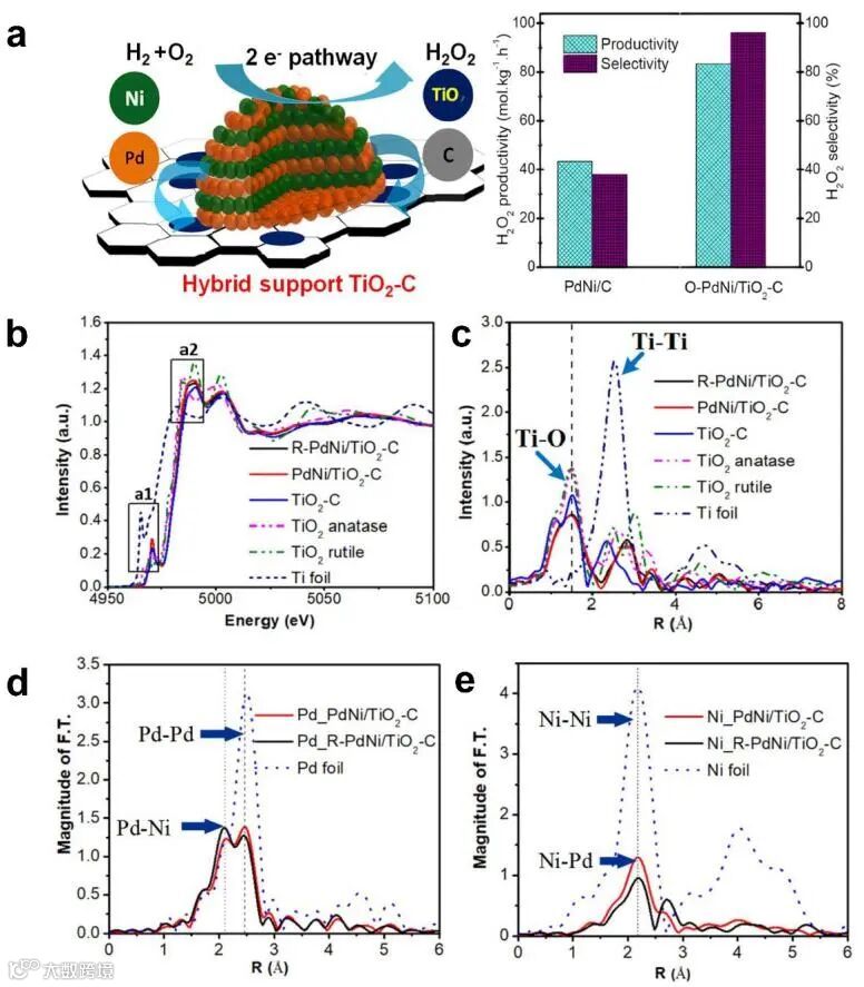 Pd基催化剂是DSHP中应用最广泛的催化剂之一,但是关于Pd活性位点的状态一直存在争议。前些年,报道主要集中于Pd0与Pd2+哪种形式更有利于合成H2O2。并且也有研究表明Pd-PdO界面的形成会有利于生成H2O2。另外,金属Pd与其他金属的界面作用以及Pd与载体之间相互作用对提高催化性能也是必不可少的。金属颗粒Pd的界面效应是提高催化剂选择性的重要方法,电子结构的变化能够从根本上抑制副反应。并且,还有研究表明,孤立的Pd活性位点属于双电子还原催化机理,与电催化氧还原反应性能很相似,具有较高的H2O2选择性。