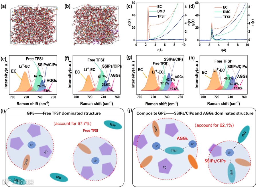 Figure 3. MD simulation snapshots of (a) LE and (b) LE with modified POSS addition. The RDF g(r) and coordination numbers n(r) were calculated through MD simulations for two systems: (c) LE and (d) LE with modified POSS. Raman spectra and the proportion of free TFSI−, SSIPs/CIPs and AGGs in the CPP-0 (e), CPP-1 (f), CPP-2 (g) and CPP-3 (h) GPE systems. (i)-(j) Schematic representation of dominated Li+ solvated structures in GPE (CPP-0) and composite GPE (CPP-2) system respectively.
