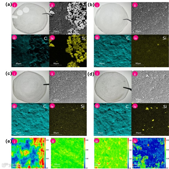 Figure 2. Dispersed characterization of unmodified and modified POSS. i) physical photographs, ii) SEM images, iii) elemental mapping of carbon and iv) elemental mapping of silicon for CP (a), CPP-1 (b), CPP-2 (c) and CPP-3 (d), respectively. (e) Two-dimensional (2D) Raman images of the CP (i), CPP-1 (ii), CPP-2 (iii) and CPP-3 (iv).