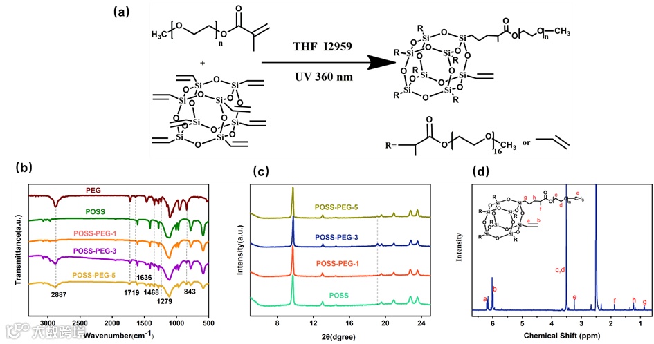 Figure 1. (a) Schematic diagram of modification of POSS. (b) FTIR spectra of POSS, PEG and PEG-modified POSS. (c) XRD patterns of POSS and PEG-modified POSS. (d) Nuclear magnetic resonance hydrogen spectra of POSS-PEG-3 in DMSO-d6.