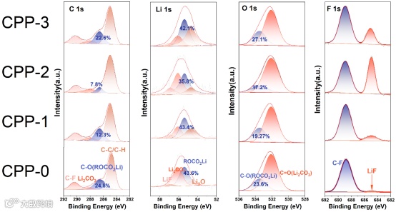 Figure 6. Compositional and structural analyses of SEI layer. XPS spectra of interfacial constituent elements from the cyclic electrodes (C1s, Li1s, O1s and F1s) of the Li||Li symmetric cells assembled with CPP-0, 1, 2, and 3, respectively.
