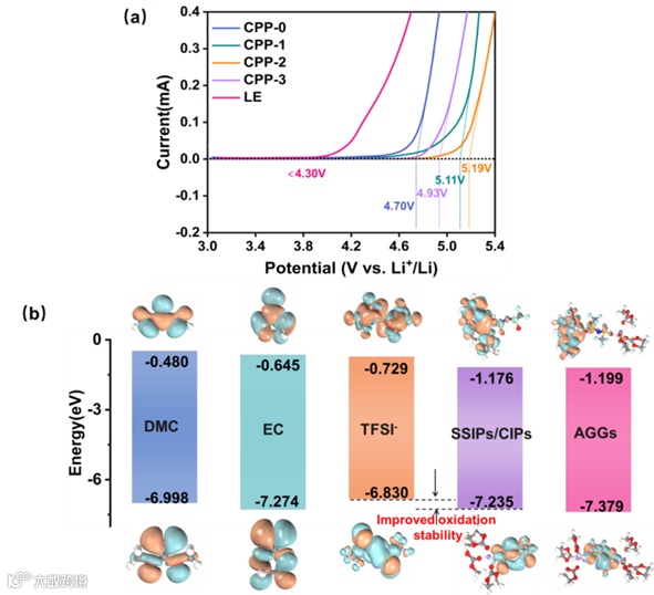 Figure 4. (a) LSV curves of different electrolytes at a scan rate of 1 mV s−1. (b) Theoretical calculation of LUMO and HOMO values for different solvents and solvated structures.