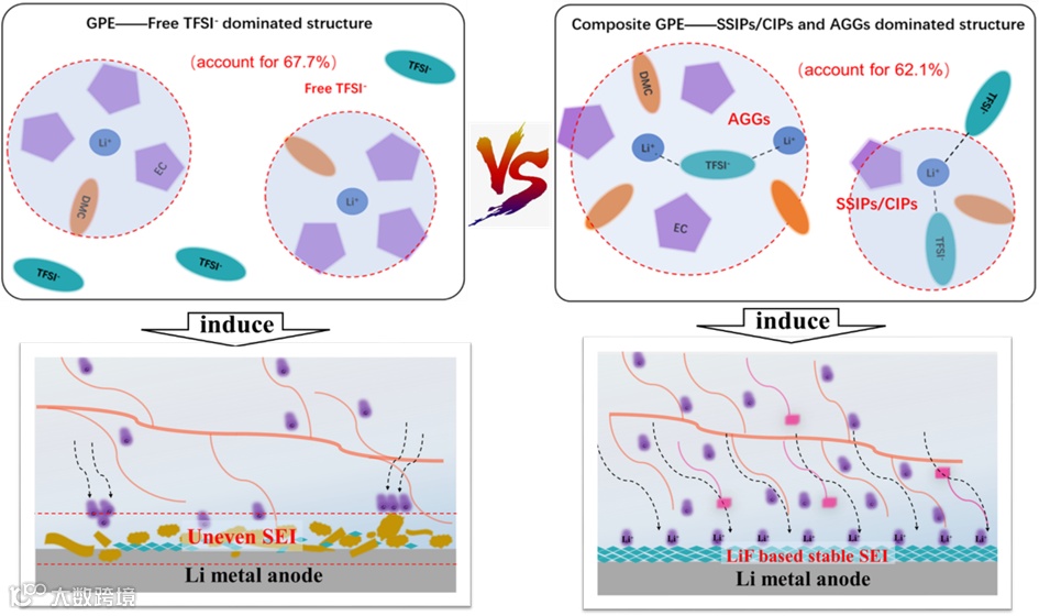 锂离子溶剂化结构对于电极/电解质界面结构及组成影响深远。然而,目前大多数研究都关注与新型凝胶电解质的开发,然而对凝胶电解质LE相的研究较少。相比纯液态电极液和固态电解质,复合凝胶电解质中多组分的相互作用会导致锂离子的配位环境相对复杂,这从而会影响到负极电解质界面生成及性能,因此对复合凝胶电解质中的锂离子传输行为和溶剂化结构研究是非常必要的。