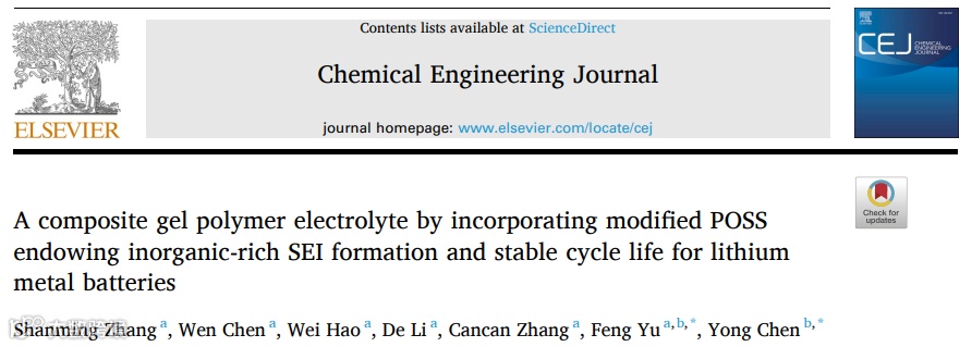近日,海南大学海南大学余凤副教授和佛山科学技术陈永教授合作,在国际知名期刊Chemical Engineering Journal上发表题为“A composite gel polymer electrolyte by incorporating modified POSS endowing inorganic-rich SEI formation and stable cycle life for lithium metal batteries”的文章。