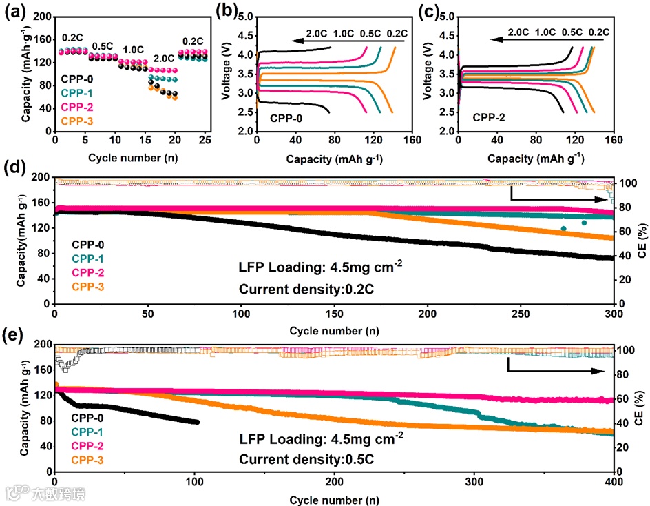 Figure 8. Electrochemical performances of Li|| LiFePO4 coin cells assemble with different GPE. (a) Rate performances of Li|| LiFePO4 coin cells and galvanostatic charge/discharge plots of (b) CPP-0-based and (c) CPP-2 based Li|| LiFePO4 coin cell at different rates. (d) Cycling performances of Li|| LiFePO4 coin cells at 0.2 C. (e) Cycling performances of Li|| LiFePO4 coin cells at 0.5C.