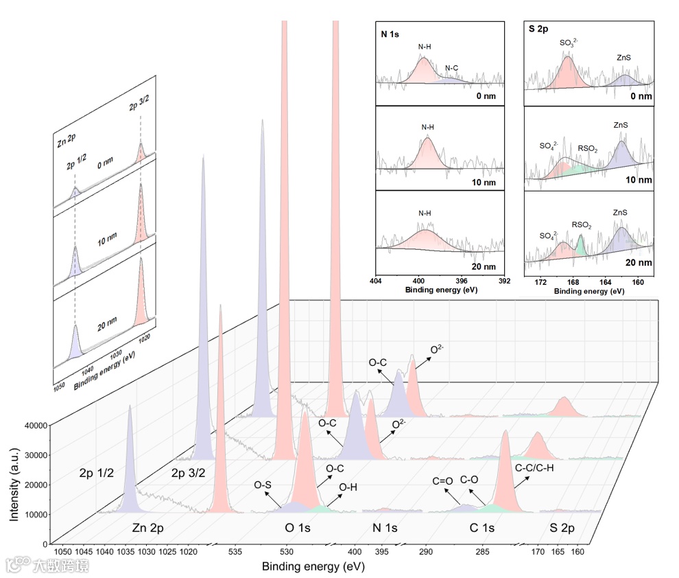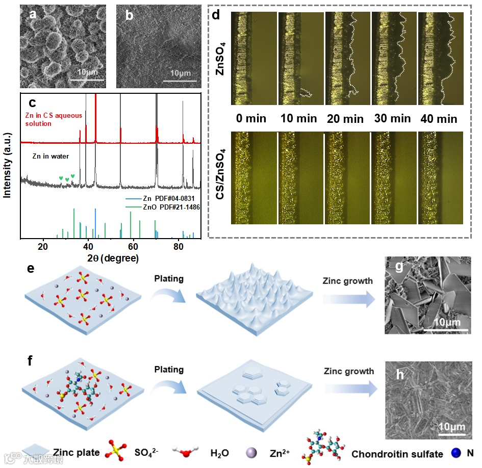 为了探索CS与Zn表面的相互作用,将Zn片分别浸入水和CS水溶液中10天。扫描电子显微镜(SEM)图像显示,浸泡在水中的锌表面可以观察到巨大的纳米花状颗粒,而浸泡在CS水溶液中的Zn片表面光滑均匀。据XRD结果显示,浸泡后锌箔表面的纳米花状颗粒为ZnO, CS水溶液中锌表面未出现杂质相,充分说明CS可以防止Zn表面与H2O发生反应。通过原位光学表征了Zn表面在1 mA cm-2下的枝晶生长情况,在ZnSO4电解液中,10min后Zn负极表面出现明显的沉积,并且随着时间的增加,枝晶生长的厚度继续增加,导致表面高度粗糙。相比之下,对于CS/ZnSO4电解质中的Zn负极,在40min后,沉积厚度仅略有增加,锌的表面形貌仍然非常平坦。因此,在合理推测的基础上,推导出CS在锌表面的作用模式。
