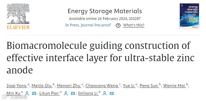 Jiaqi Yang, Meijia Qiu, Mengni Zhu, Chaocang Weng, Yue Li, Peng Sun, Wenjie Mai, Min Xu*, Likun Pan*, Jinliang Li*, Biomacromolecule guiding construction of effective interface layer for ultra-stable zinc anode, 2024,