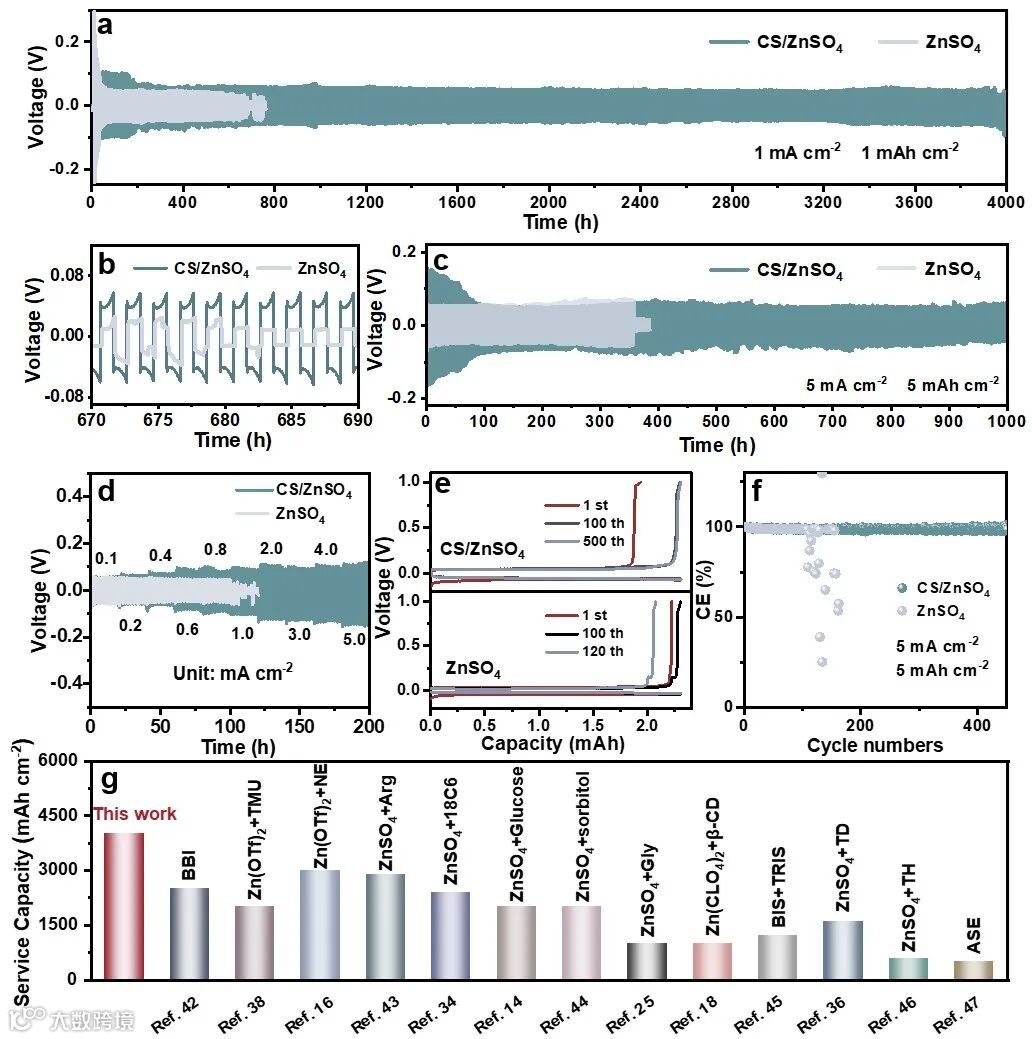 要点三:CS电解液添加剂的引入实现了金属锌/电解液有效界面层的构建,使Zn//Zn对称电池稳定循环超4000小时