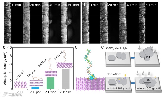 在电流密度为2 mA cm-2下,(a) 1 M硫酸锌和 (b) PEG-oSDE电解液锌电极电镀过程的原位光学显微镜图。(c) 不同构型的水和PEG分子在Zn (002) 和Zn (101) 晶面上的吸附能。(图中Zn-H2O-002标志为Z-H,Zn-PEG-parallel-002标志为Z-P-par,Zn-PEG-vertical-002标志为Z-P-ver,Zn-PEG-vertical-101标志为Zn-P-101)。(d) Zn (002)-PEG模型的差分电荷密度,以ter-OH与Zn原子相互作用为例。(e) 端羟基氧原子诱导Zn (002) 表面暴露的示意图。