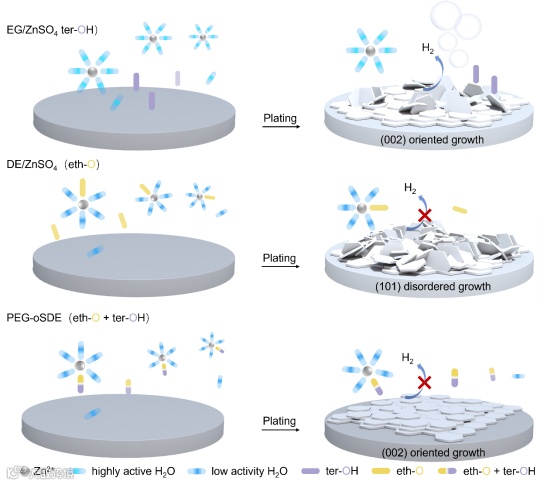 图3. 双模块分子中端羟基氧原子(ter-OH)引导了PEG-oSDE体系Zn(002)晶面的暴露。