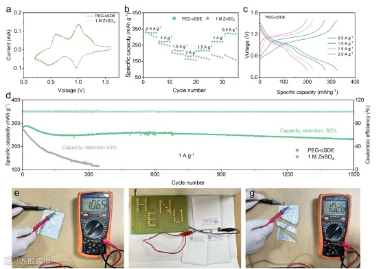 (a) 在0.1 mV s-1的扫描速率下,不同电解液中Zn||V2O5全电池CV曲线。(b) 在传统1 M硫酸锌电解液和PEG-oSDE中全电池倍率性能。(c) PEG-oSDE中不同电流密度 ( 0.5、1.0、1.5和2.0 A g-1) 下的放电曲线。(d) 在传统1 M硫酸锌电解液和PEG-oSDE中Zn||V2O5全电池的循环性能。(e) 软包电池显示开路电压的照片。(f) 软包电池可点亮LED灯。(g) 对软包电池进行切割试验。