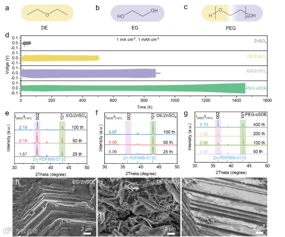 (a) 仅含醚基氧-乙醚 (DE)、(b) 仅含端羟基氧-乙二醇 (EG)、(c) 含两种类型氧-PEG分子结构式。(d) 在不同电解液中,在1 mA cm-2-1mAh cm-2条件下,Zn||Zn对称电池的循环性能。在 (e) EG/ZnSO4、(f) DE/ZnSO4、(g) PEG-oSDE中循环后的XRD。在 (h) EG/ZnSO4、(i) DE/ZnSO4、(j) PEG-oSDE中,经过100个循环后的Zn阳极的形貌的扫描电镜表征。
