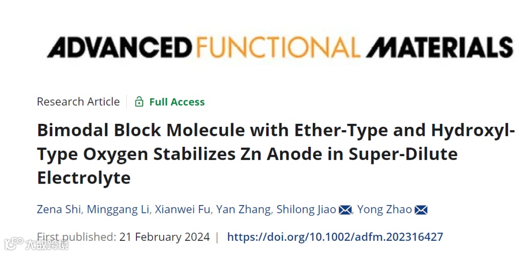 Bimodal Block Molecule with Ether-Type and Hydroxyl-Type Oxygen Stabilizes Zn Anode in Super-Dilute Electrolyte. Advanced Functional Materials, 2023, DOI: 10.1002/adfm.202316427