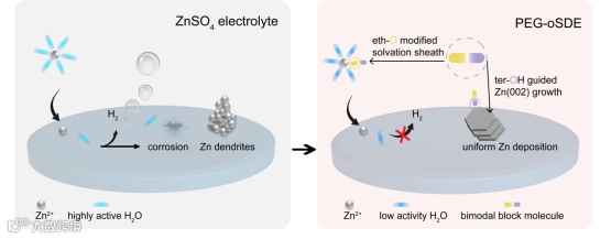 图2. 双模块分子中的醚基氧(eth-O)改性锌离子溶剂化壳层和PEG-oSDE的氢键网络。