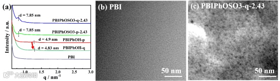 图3 PBI、PBIOH和PBIPhOSO3膜中形成的离子簇的特征(a)SAXS离子峰;(b)PBI(c)PBIPhOSO3-q-2.43的TEM图像