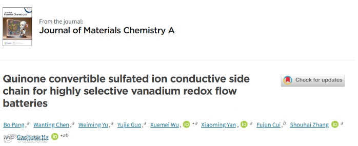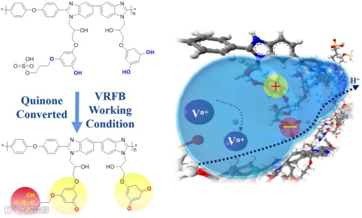 近日,来自大连理工大学的贺高红教授和吴雪梅教授团队,在国际知名期刊Journal of Material Chemistry A上发表题为“Quinone convertible sulfated ion conductive side chain for highly selective vanadium redox flow batteries”研究型文章。该研究型文章设计了具有硫酸酯化酚羟基功能侧链的离子传导膜,在液流电池强酸与氧化性条件下发生酚羟基向醌基结构转换,ζ电势增加使钒离子渗透降低,获得较高的氢/钒离子选择性和全钒液流电池性能。