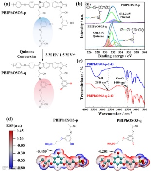 图2. PBIPhOSO3-q膜中的醌化学转化(a)化学转化示意图。(b)高分辨率O1s测试谱图,(c)醌转化前后的FTIR测试谱图;(d)苯酚和醌氧原子的DFT模拟