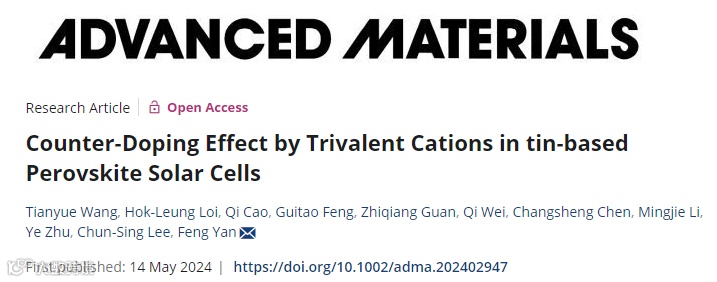近日,来自香港理工大学的严锋教授团队在国际知名期刊Advanced Materials上发表题为“Counter-Doping Effect by Trivalent Cations in Tin-Based Perovskite Solar Cells”的文章。该文章报道了利用三价阳离子(例如Sb3+ 和 In3+)取代晶格中的Sn2+来反掺杂被氧化的锡基钙钛矿,从而提升太阳能电池的性能。研究系统地分析了Sb3+的引入对锡基钙钛矿薄膜电学性质的影响,并重点揭示了部分Sb3+参与已轻微氧化了的锡钙钛矿薄膜的反掺杂机制。结果表明,Sb3+可有效降低锡基钙钛矿的p型掺杂浓度至1014 cm-3,提升薄膜中载流子的寿命。此外,Sb3+还能有效钝化由碘空位引入的深能级缺陷,提高薄膜的载流子迁移率。目标器件的能量转换效率相对提升了31.4%,并且具有出色的长程稳定性。这项工作提供了一种全新的策略来提高锡基钙钛矿太阳能电池的性能,同时也提供了一种通用的方式来补偿锡基钙钛矿在光电器件中的氧化问题。