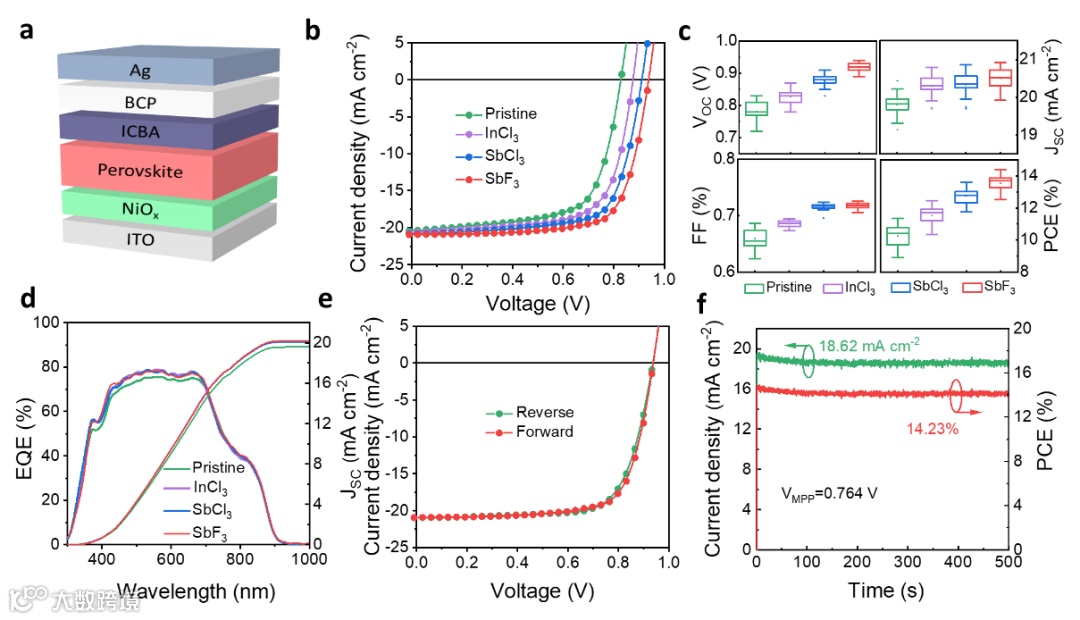 Figure 1. (a) Schematic illustration of the device structure of Sn-based PSCs. (b) The J-V curves of the best-performed devices with the pristine perovskite and perovskites doped with InCl3, SbCl3and SbF3at an optimized molar ratio of 0.015%, 0.01% and 0.01% respectively under forward scan directions. (c) VOC, JSC, FF and PCE statistics of PSCs of each condition. (d) EQE spectra and integrated JSC of the pristine and trivalent metal halides doped PSCs. (e) The J-V curves of the best-performed SbF3-doped devices under both the reverse (green circle) and forward (red circle) scan directions. (f) The stabilized power output for the champion SbF3-doped device.