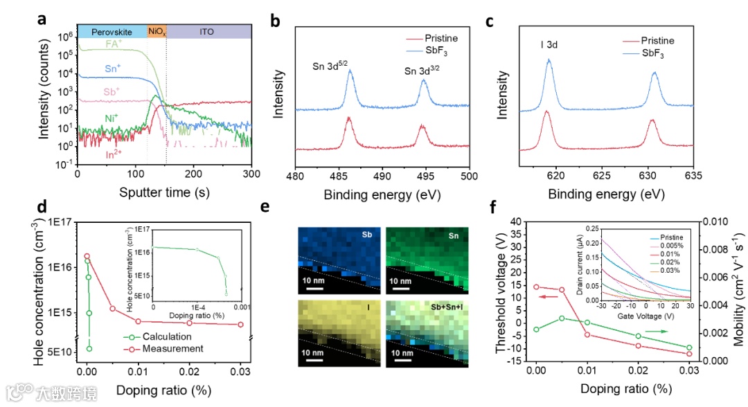 Figure 2. (a) ToF-SIMS depth profile of Sb ion in SbF3modified perovskite film deposited on NiOx/ITO. XPS Sn 3d core-level spectra (b) and I 3d core-level spectra (c) of pristine and SbF3doped perovskite films. (d) Theoretical and measured hole concentrations of SbF3 doped- perovskite films at varied doping ratios as determined from hall characterizations. Inset: magnified theoretical hole concentrations of SbF3 doped- perovskite films at varied doping ratios. (e) STEM-HAADF image of a perovskite grain and the STEM−EELS maps of Sb, Sn, and I as well as the superposition of the elements corresponding to 0.01% SbF3doped perovskite film. The region between two dash lines correspond to the grain surface. (f) Calculated threshold voltage and mobility from transfer curves of field-effect transistors (see inset in (f)) prepared by depositing the pristine and SbF3 doped perovskite films at varied concentrations on SiO2/Si substrates. VD=0.5 V.