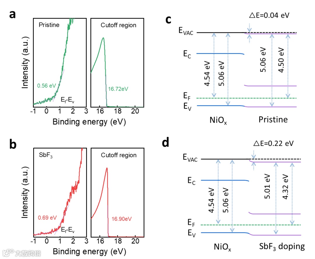 Figure 3. UPS spectra of the pristine (a) and SbF3doped (b) perovskite films. The schematic energy band diagrams between the NiOx hole transport layer and the pristine perovskite layer (c) or SbF3doped perovskite layer (d).