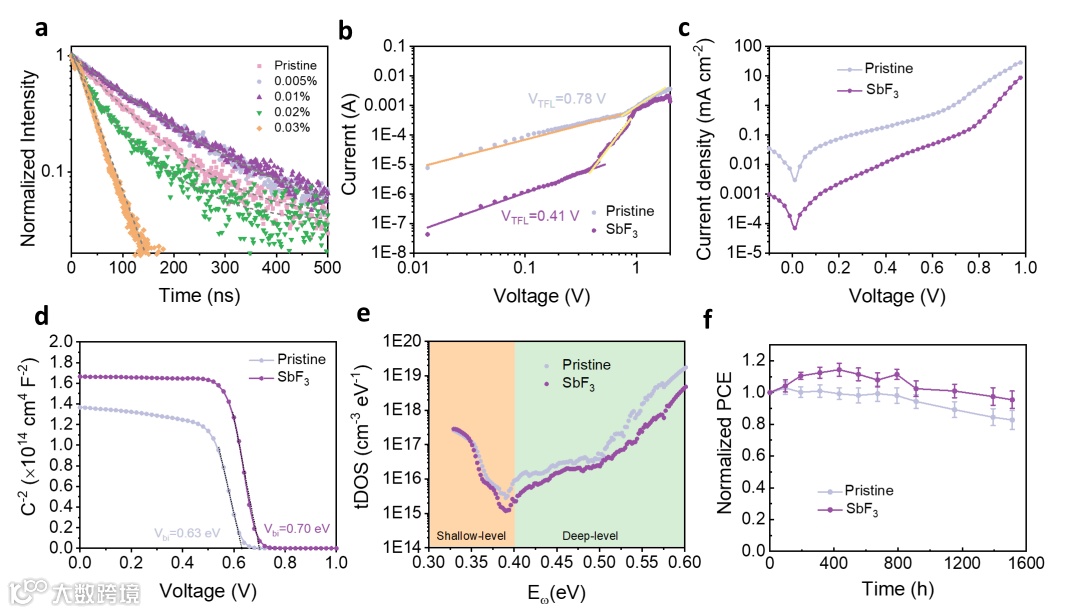 Figure 4. (a) Time-resolved photoluminescence spectra of the pristine and SbF3doped perovskite films with varied concentrations deposited on quartz substrates. (b) I−V curves of corresponding electron-only devices. (c) Dark J-V curves of corresponding PSCs. (d) Mott−Schottky plot analysis. (e) tDOS curves obtained through admittance spectroscopy of PSCs. (f) Long-term stability of the pristine and SbF3doped devices stored in N2 filled glovebox.