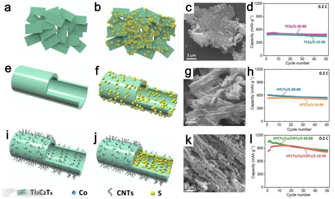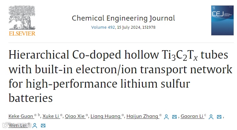 近日,武汉科技大学雷文副教授/张海军教授团队,联合南京理工大学李高然教授,在国际知名期刊Chemical Engineering Journal上发表题为“Hierarchical Co-doped Hollow Ti3C2TxTubes with Built-in Electron/Ion Transport Network for High-Performance Lithium Sulfur Batteries”的研究文章。该研究文章通过借助钴纳米颗粒的催化作用,创新性地在Ti3C2TxMXene纳米片构建的中空管管壁内外原位合成碳纳米管导电网络结构,构筑具有多级孔结构的MXene基复合材料(HTCTs/Co/CNTs),显著改善了MXene纳米片的堆叠团聚问题,提高了其导电性能。得益于结构与组分的协同作用,该复合材料为活性物质硫提供了足够的存储空间,解决了硫载量低的问题;同时实现了MXene基载硫材料对多硫化物物理限域和化学吸附,提升了多硫化物的催化转化能力,提高了正极硫的利用率和循环稳定性。