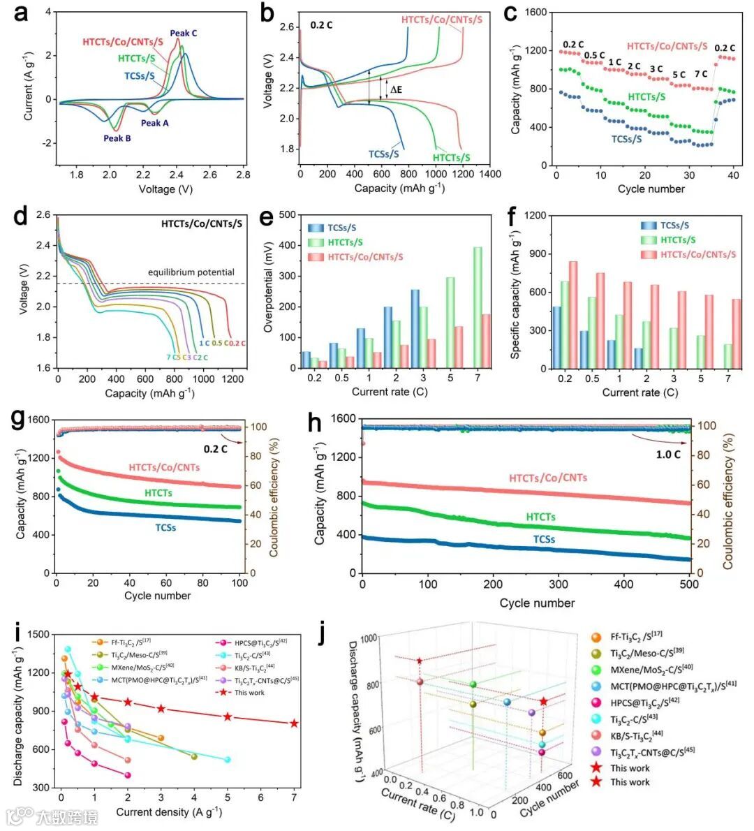 得益于多级孔结构的设计,HTCTs/Co/CNTs复合材料表现出优异的物理吸附作用;金属Co纳米颗粒的引入,显著提高了MXene材料对多硫化物的化学吸附和催化转化能力。这些结果表明HTCTs/Co/CNTs复合材料对多硫化物的转化具有优异的双向催化特性,可以显著缓解了充放电过程中的穿梭效应,加快多硫化物的转化反应动力学。