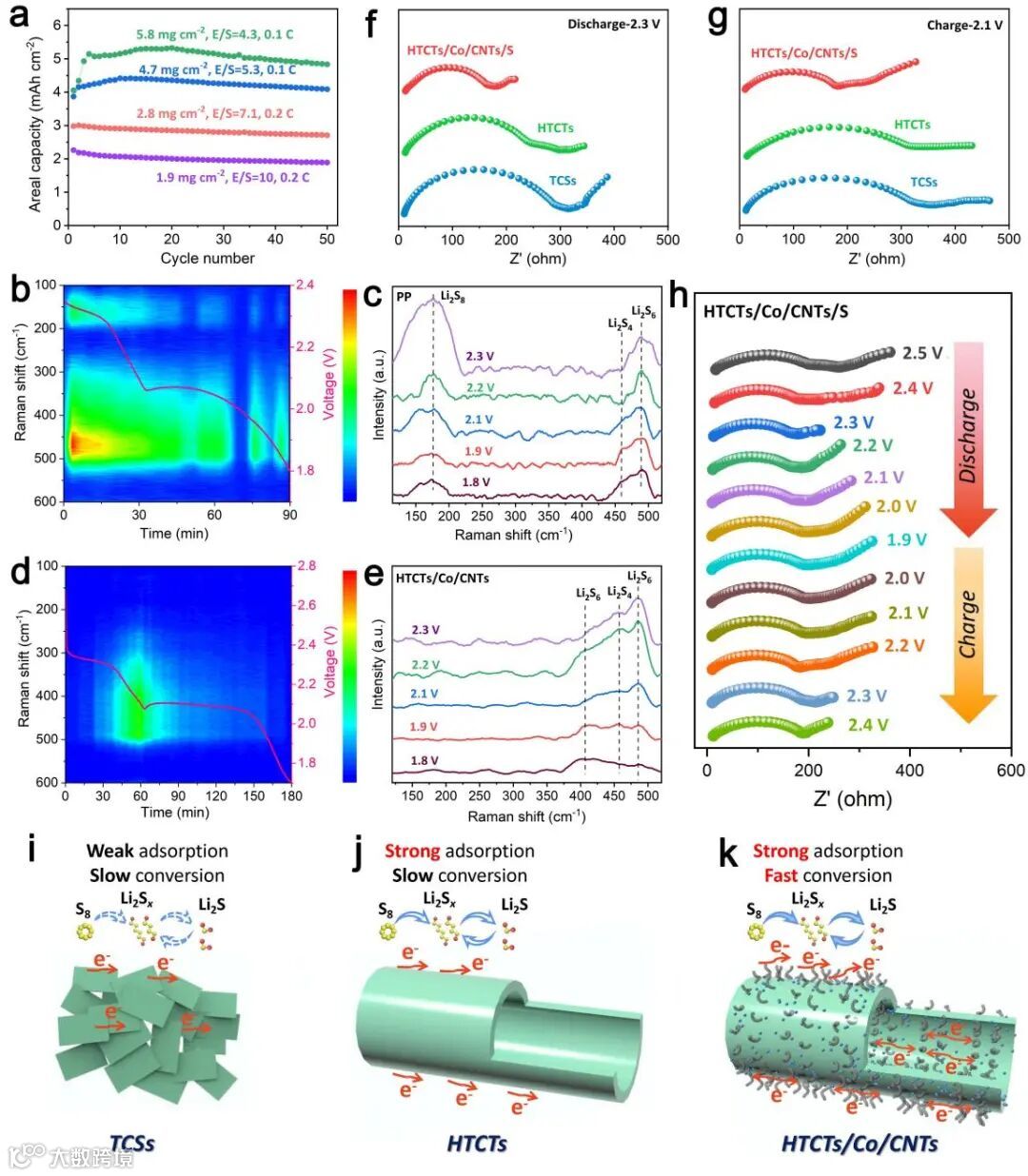 图7. HTCTs/Co/CNTs材料高硫载量和贫电解液的电化学性能测试,HTCTs/Co/CNTs/S电极的原位拉曼、原位阻抗及多硫化物转化机理示意图