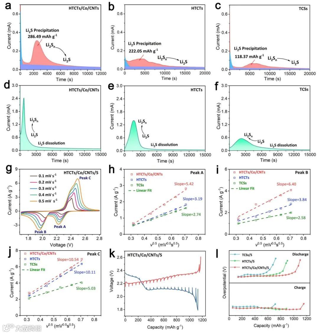 图4. HTCTs/Co/CNTs复合材料对多硫化锂的催化转化效率和转化动力学