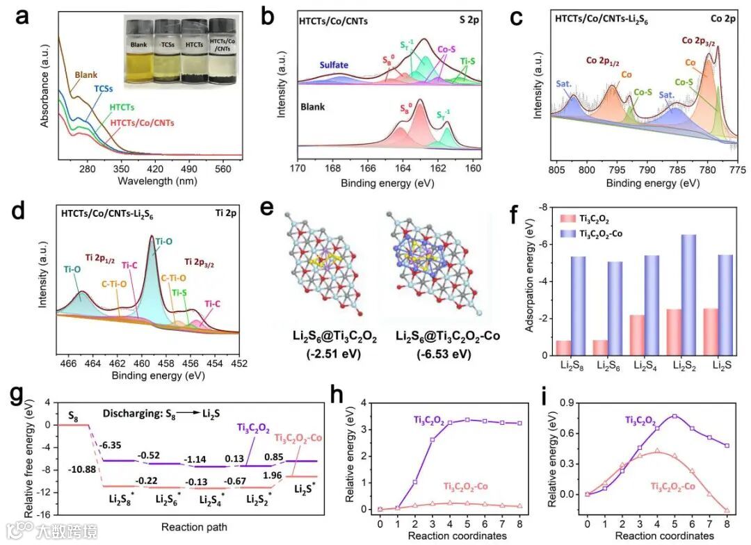图3. HTCTs/Co/CNTs复合材料对多硫化锂的吸附性能表征以及DFT模拟计算结果