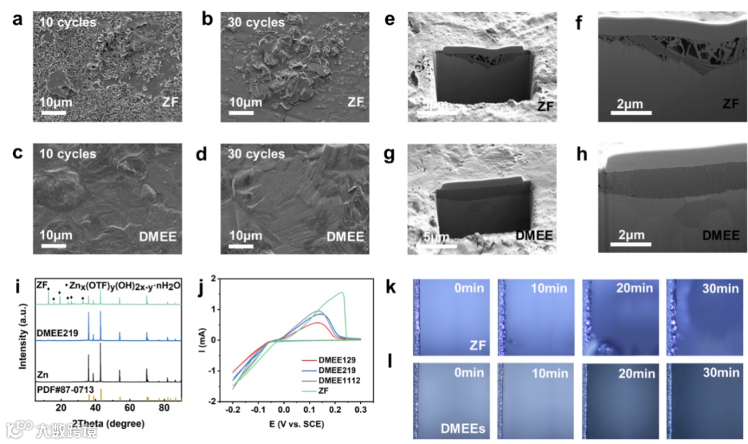 a-d) 锌负极在ZF (a,b)和DMEE(c,d)中循环10次和30次的SEM图片。e-h)在ZF (e,f)和DMEE(g,h)中循环30次后,锌负极的FI图片。i)锌负极在ZF和DMEE中循环30次后的XRD图谱。j) CV曲线。k, l) ZF和DMEE中锌沉积的原位光学显微表征。