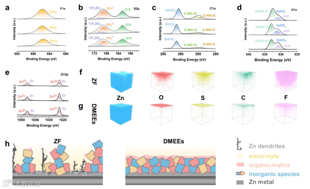 XPS和TOF-SIMS结果表明,DMEE中的Zn负极SEI中富含有机和无机成分,包括ZnF2、ZnS、ZnSO3、ZnCO3、ZnO等,DMEEs中的SEI结构能有效抑制锌枝晶,有利于形成高度可逆的Zn2+沉积,从而提高了Zn负极的稳定性和可逆性。