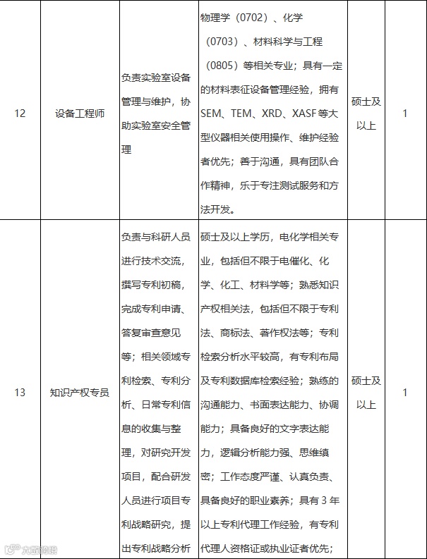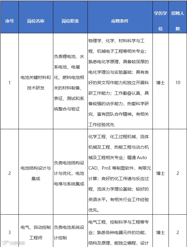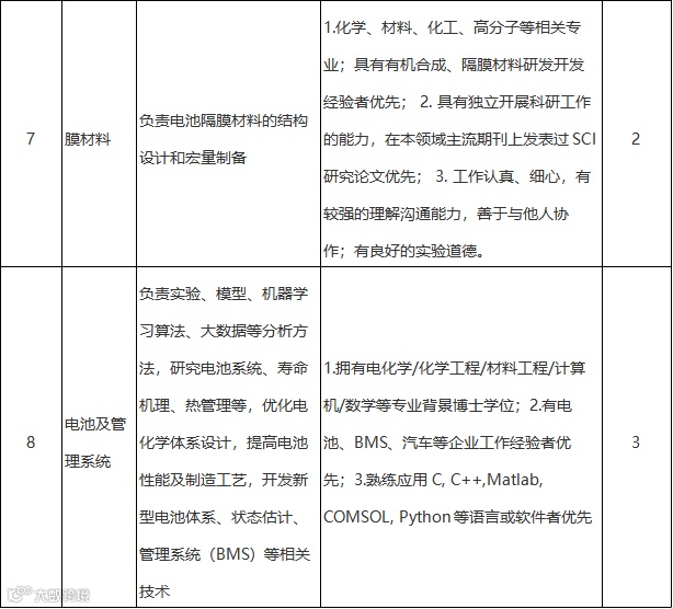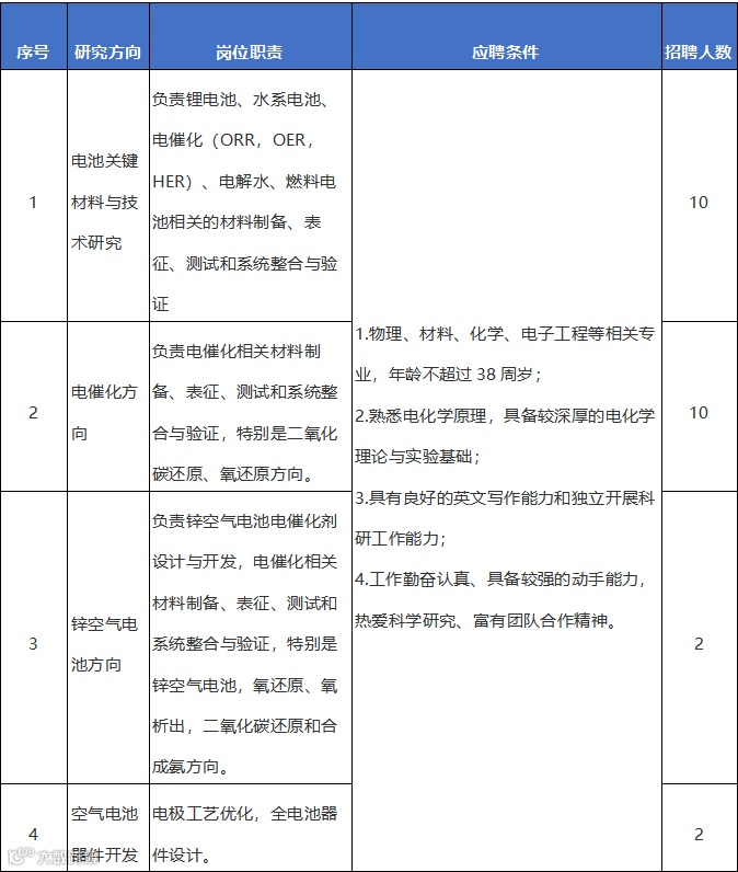 因发展需要,现面向海内外诚聘电池关键材料与技术相关领域、储能领域、电化学、电催化、物理化学、材料学、电子工程、数据分析、人工智能、计算化学、机器学习、分子动力学模拟等相关领域的研究人员若干名。