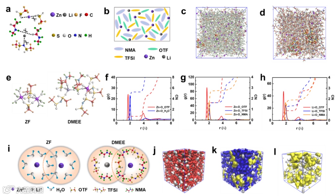 a) DMEEs形成过程中离子键和氢键的断裂。b) DMEE中NMA分子和离子聚集体对Zn2+和Li+的溶剂化。c, d) ZF 和 DMEE219 的MD 模拟快照。e) 从MD模拟中提取的放大的 Zn2+ 溶剂化结构。f-h) ZF 和 DMEE219 的 RDF g(r) 和配位数 N(r)。i) ZF 和 DMEE219 中的平均 Zn2+ 溶剂化结构。j-l) ZF和DMEE219的离子和分子聚集分布。